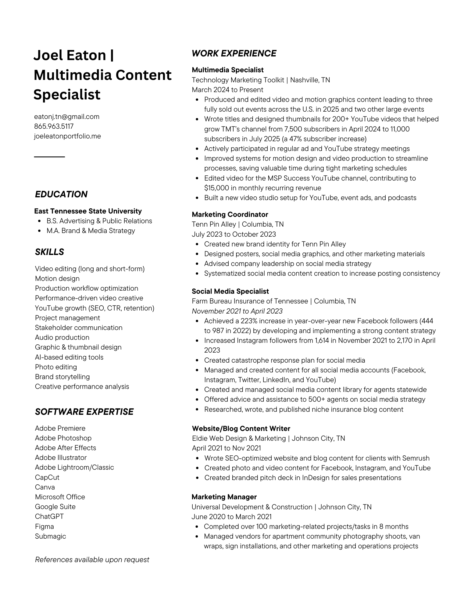 “Joel’s content is nothing short of exceptional! He is a master at combining visuals with audio to create compelling stories that capture the viewer’s attention. He’s also dedicated to consistently developing his craft, always pushing himself to learn more and find new and innovative ways to do something he hasn’t done before. I thoroughly enjoy seeing Joel take instructions, ideas, clips, etc. and bringing everything together to make something truly special come to life.”